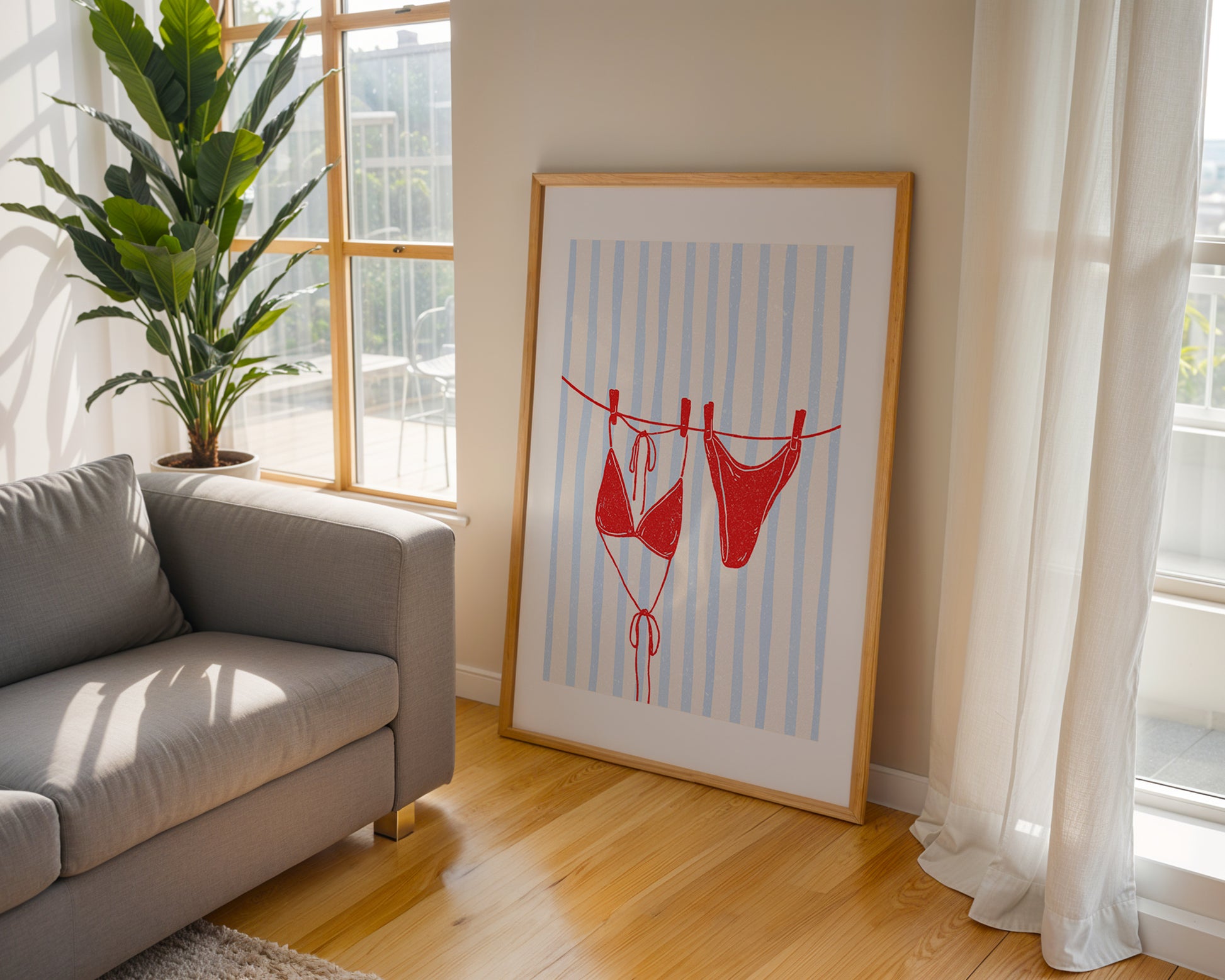 Red Bikini on Clothesline - Digital Poster (A3) printable wall art — an A3 digital poster (297×420 mm, 300 DPI) for instant download. Inspired by a3 poster, beach home decor, bikini poster, blue stripes print design, this high‑resolution artwork brings a curated gallery look to your space.